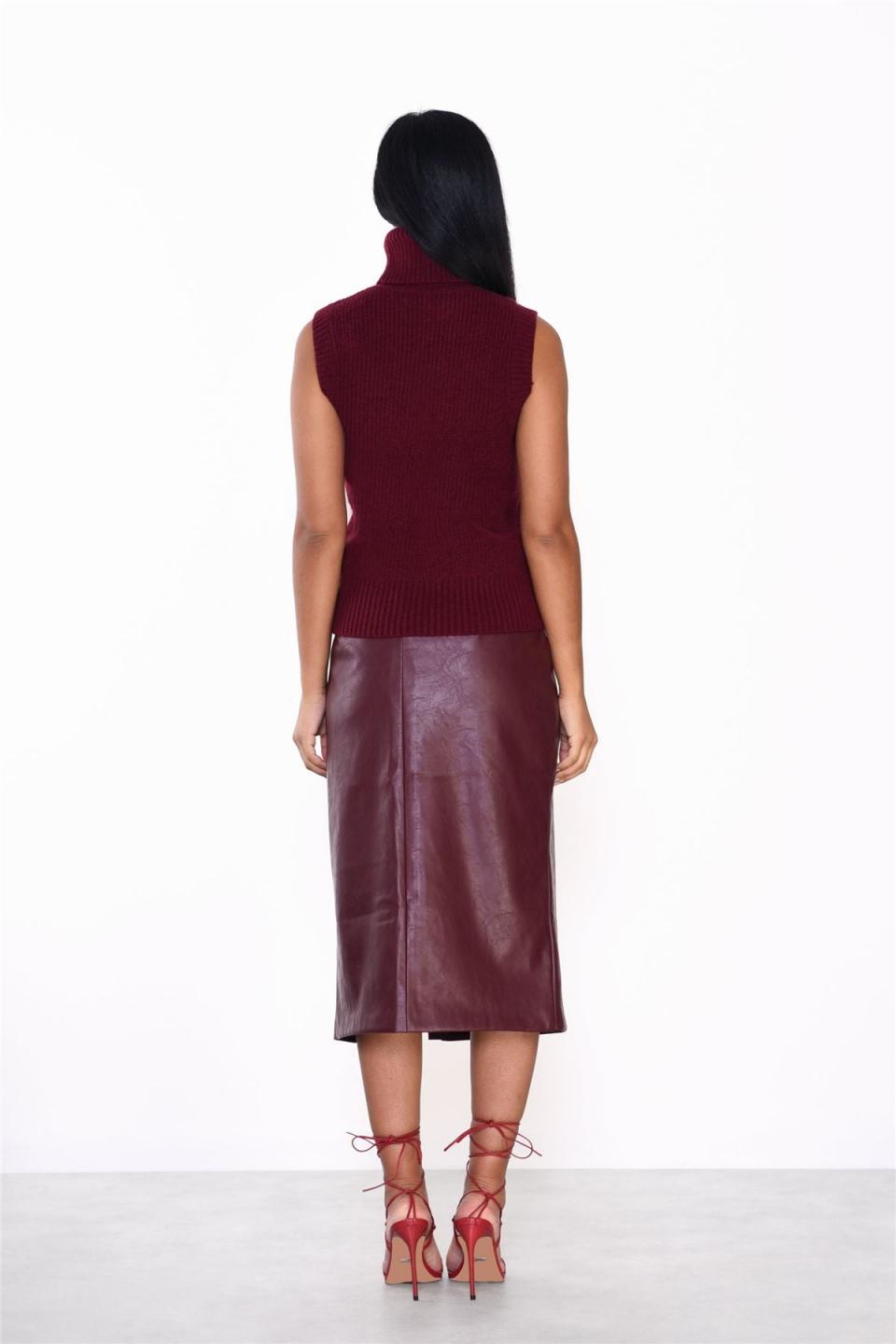Glamorous Women’s Burgundy Sleeveless Knit-Top. he burgundy knit sleeveless top is a versatile addition to your wardrobe, perfect for layering or wearing on its own. With its high neckline, it offers a chic and polished look that can easily transition from day to night. The vest style gives it a relaxed fit, making it comfortable for all-day wear. Crafted from soft knit fabric, this top feels great against the skin and adds a touch of warmth without bulk. Pair it with a long-sleeve shirt underneath for a stylish layered look or wear it with high-waisted jeans for a casual outing. This top is a fantastic choice for those looking to combine comfort with effortless style. DETAILS Sleeveless High Neckline vest style knit SIZE & FIT Composition: 58% Acrylic, 15% Polyamide, 27% Polyester Model Wears Size 10 Model Height: 5’10”